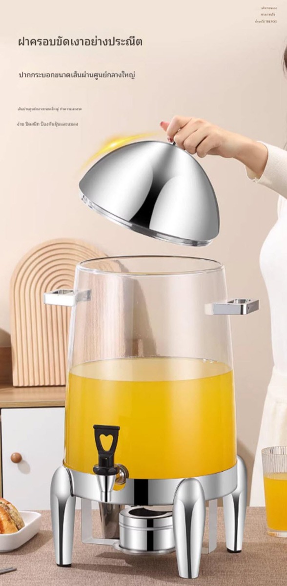 โถจ่ายเครื่องดื่มความจุ 12 ลิตร ตัวถังพลาสติก PC ใส แข็งแรง มองเห็นเครื่องดื่มชัด เหมาะสำหรับน้ำผลไม้ ชา กาแฟ และเครื่องดื่มร้อน–เย็น ใช้งานได้ทั้งแบบกระปุกแอลกอฮอล์และแบบแผ่นทำความร้อนไฟฟ้า ดีไซน์สแตนเลสสวยงาม เหมาะกับโรงแรม บุฟเฟ่ต์ คาเฟ่ และงานจัดเลี้ยง