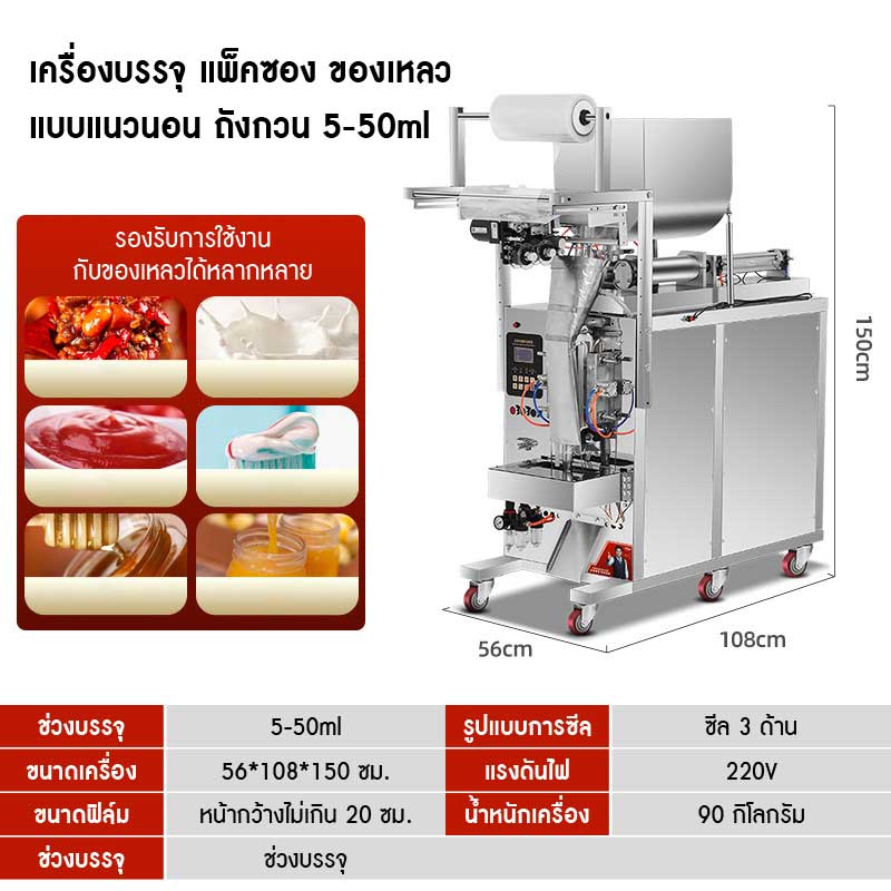 เครื่องบรรจุและแพ็คซองอัตโนมัติขนาด 5–50 มล. ระบบซีล 3 ด้าน เหมาะสำหรับบรรจุของเหลวหรือกึ่งของเหลว เช่น ซอส น้ำจิ้ม น้ำมัน แชมพู เจล หรือเครื่องสำอาง ตัวเครื่องผลิตจากสแตนเลส แข็งแรง ทนทาน ใช้งานง่าย ควบคุมด้วยระบบดิจิทัล รองรับการผลิตต่อเนื่องในระดับร้านค้า SME และโรงงานอุตสาหกรรมอาหารหรือเครื่องสำอาง