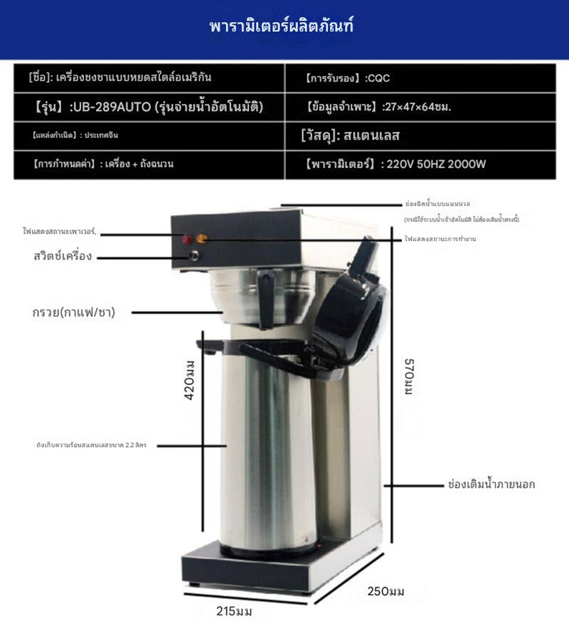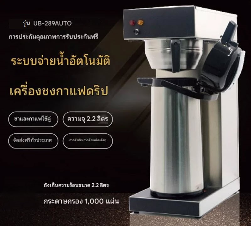 เครื่องชงกาแฟแบบดริปอัตโนมัติ รุ่น UB-289AUTO เหมาะสำหรับสำนักงาน ร้านอาหาร หรือโรงแรม ชงกาแฟปริมาณมากได้ในเวลาอันรวดเร็ว มาพร้อมเหยือกเก็บอุณหภูมิแบบปั๊มกด ลดขั้นตอนในการเสิร์ฟและเก็บกาแฟให้อุ่นนานขึ้น