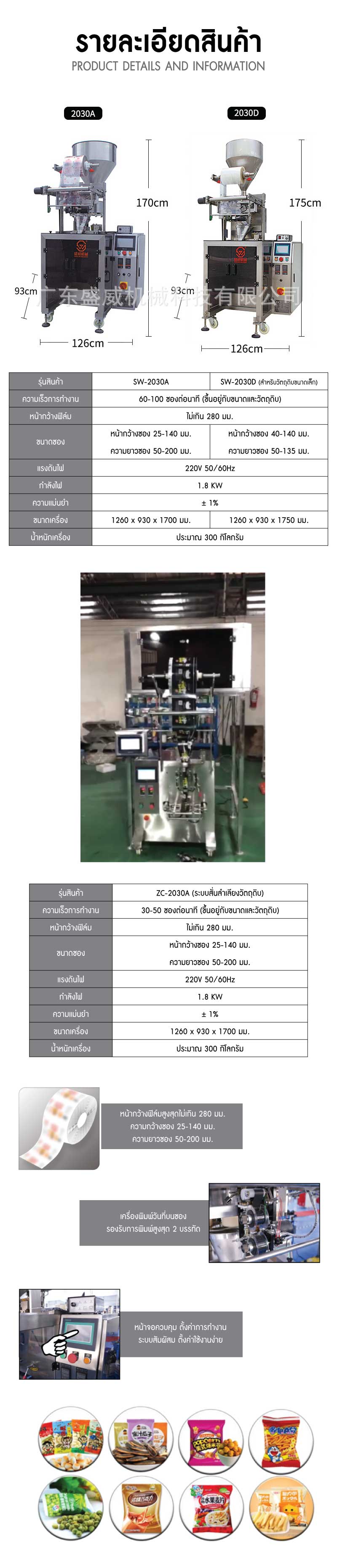 เครื่องแพ็คบรรจุซองอัตโนมัติ Automatic Filling and Packing Machine รุ่น SW-2030A วัสดุสเตนเลส 304 บรรจุถั่ว แพ็คซอง