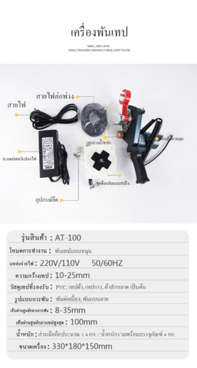 เครื่องพันเทปอัตโนมัติแบบมือถือ รุ่น AT-100 ออกแบบมาสำหรับงานพันสายไฟ ท่อ หรือชิ้นงานทรงกระบอก ช่วยให้การพันเทปสม่ำเสมอ รวดเร็ว ลดแรงงาน และเพิ่มคุณภาพงาน เหมาะสำหรับงานอุตสาหกรรม งานไฟฟ้า และงานประกอบทั่วไป