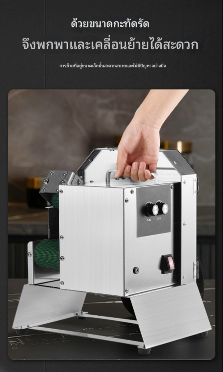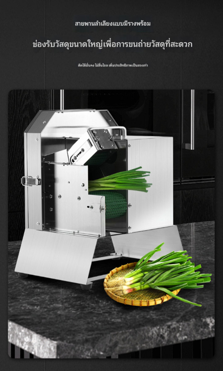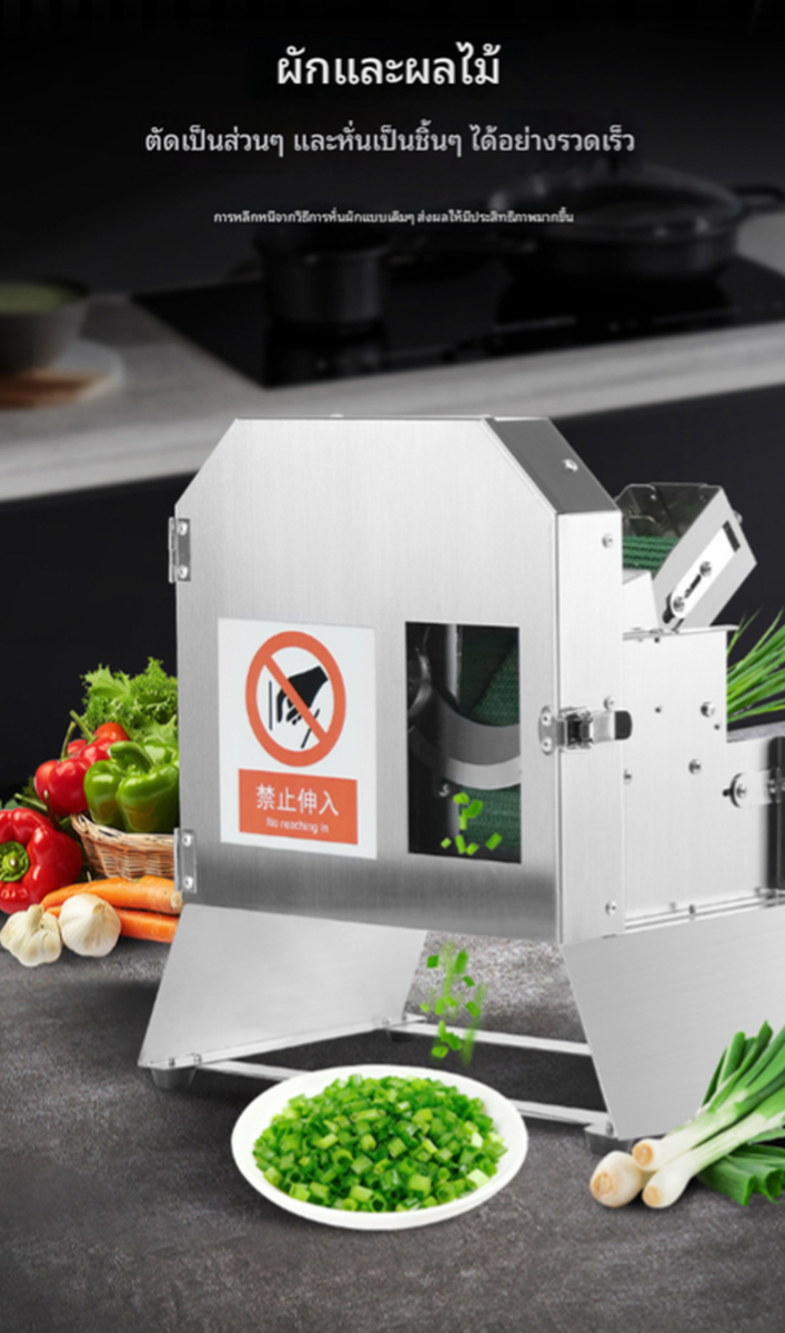 เครื่องหั่นผักระบบสายพาน กำลังไฟ 300W ปรับความหนาชิ้นผักได้ตั้งแต่ 1.5–35 มม. หั่นได้รวดเร็ว สม่ำเสมอ ตัวเครื่องสแตนเลส 201 แข็งแรง ใบมีดสแตนเลส 420 คม ทนทาน เหมาะสำหรับร้านอาหาร ครัวเรือน และงานเตรียมวัตถุดิบที่ต้องการความเร็วและความสม่ำเสมอ