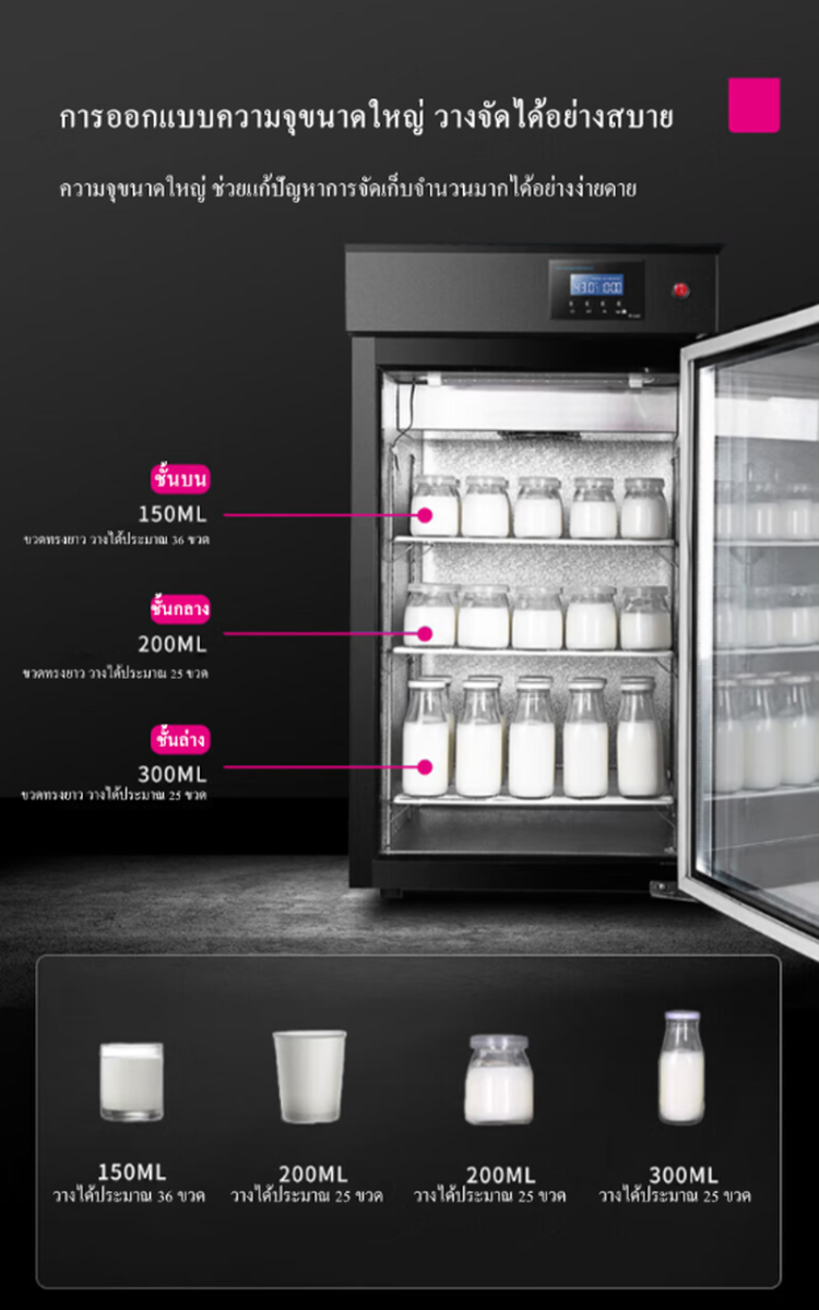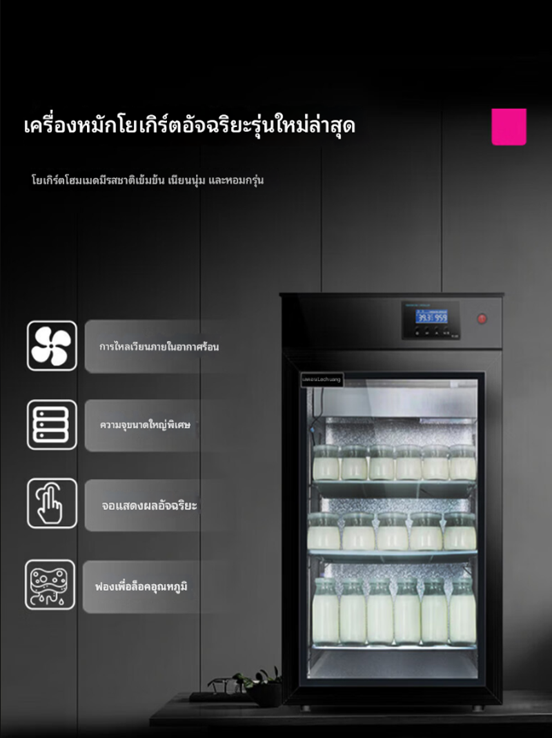 เครื่องทำโยเกิร์ตอัตโนมัติ แบบตู้ ควบคุมอุณหภูมิอย่างสม่ำเสมอ เหมาะสำหรับการหมักโยเกิร์ตให้ได้เนื้อสัมผัสดี รสชาติคงที่ รองรับการจัดเรียงขวดหลายชั้น ใช้งานง่าย เหมาะสำหรับร้านอาหาร คาเฟ่ ฟาร์มโคนม ครัวกลาง และผู้ที่ต้องการผลิตโยเกิร์ตคุณภาพในเชิงพาณิชย์หรือกึ่งอุตสาหกรรม