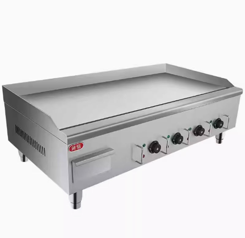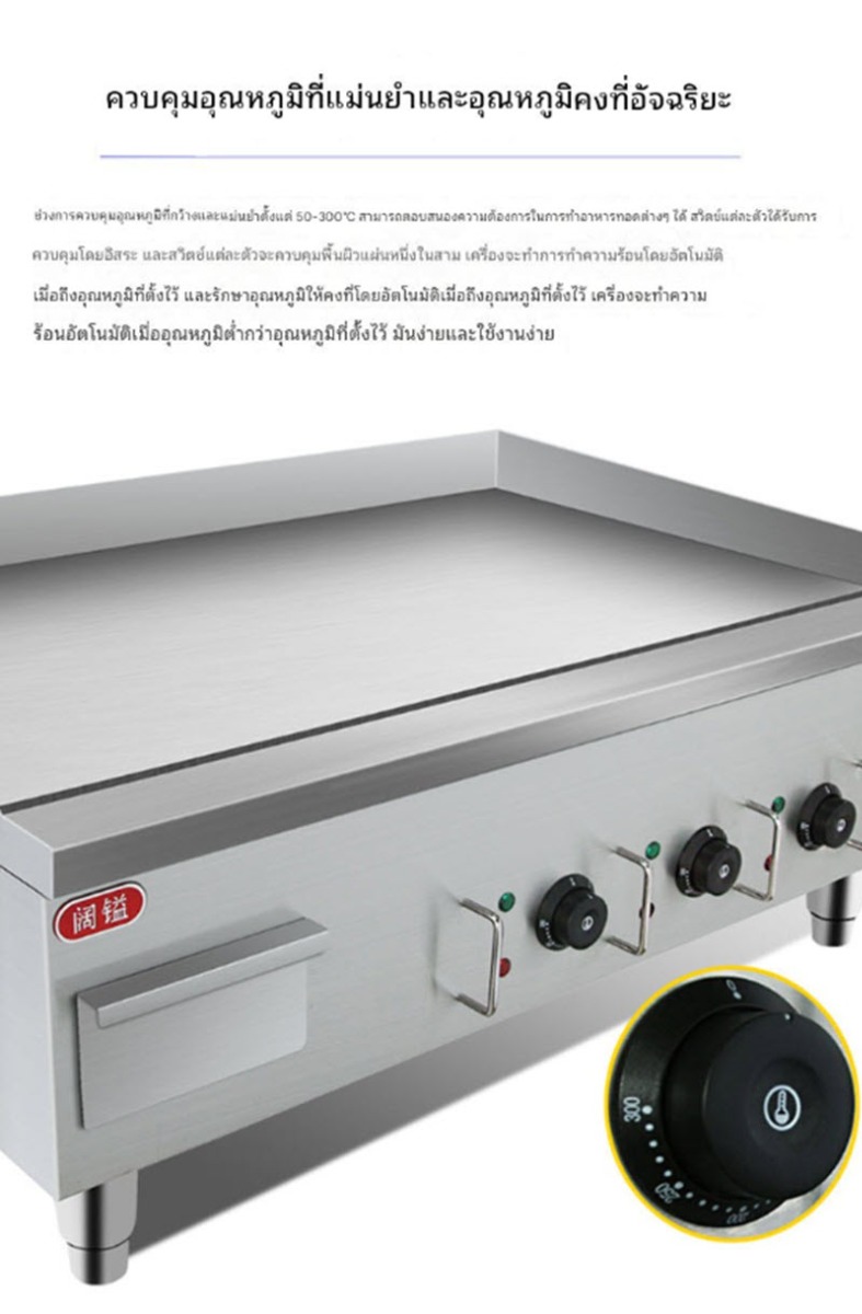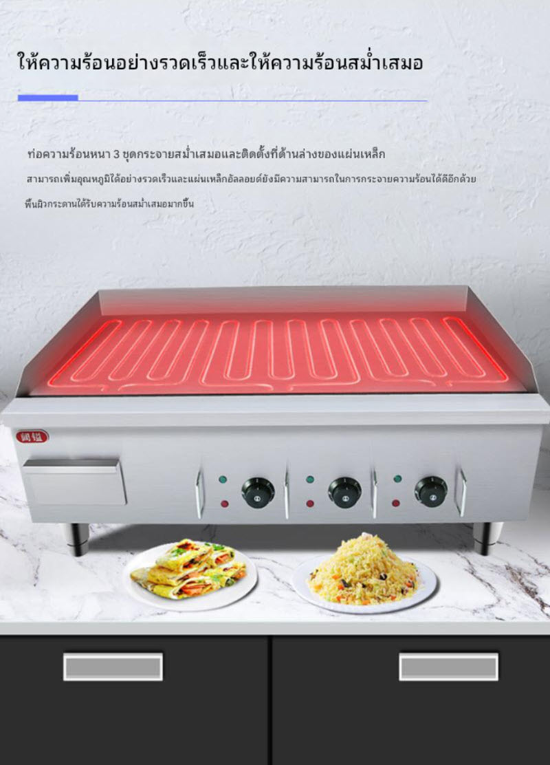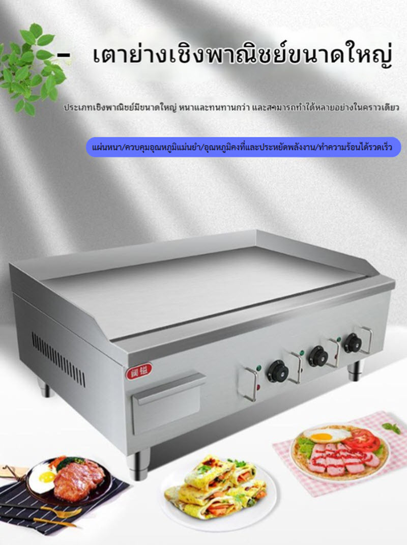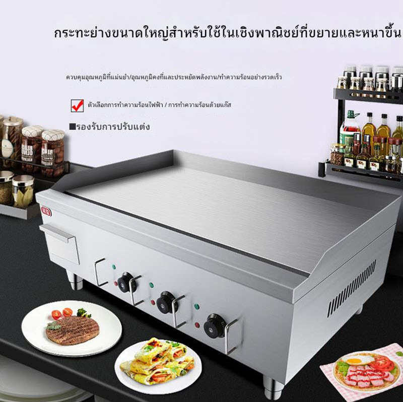 เตาย่างกระทะเรียบเชิงพาณิชย์ ขนาดใหญ่ แผ่นเหล็กหนาพิเศษ ให้ความร้อนสม่ำเสมอ มาพร้อมหัวควบคุมอุณหภูมิ 3 โซน แยกการทำงานอิสระ เหมาะสำหรับทอดไข่ เบคอน แพนเค้ก เนื้อสัตว์ หรืออาหารเช้าหลากหลายประเภท ตัวเครื่องแข็งแรง ทนความร้อนสูง ใช้งานต่อเนื่องได้ยาวนาน ประหยัดไฟและสะดวกต่อการทำความสะอาด