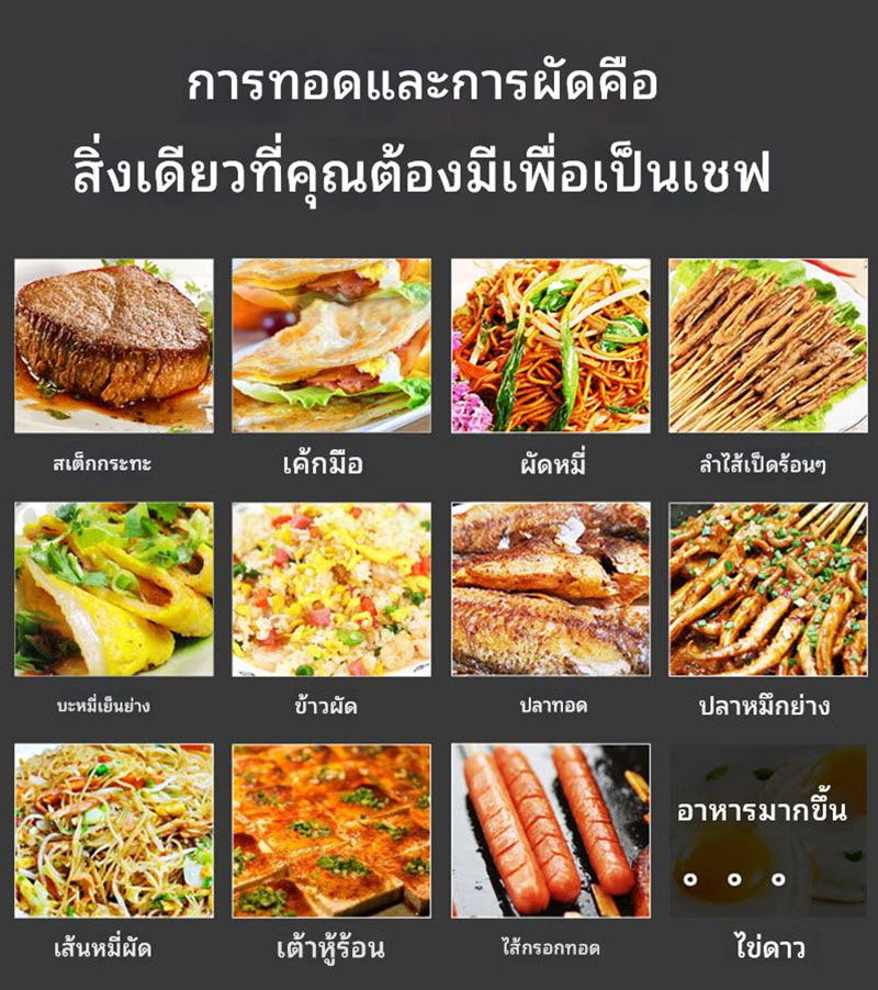 • ปรับอุณหภูมิแยกแต่ละหัวตามประเภทอาหาร เช่น 180°C สำหรับไข่ / 230°C สำหรับเนื้อ