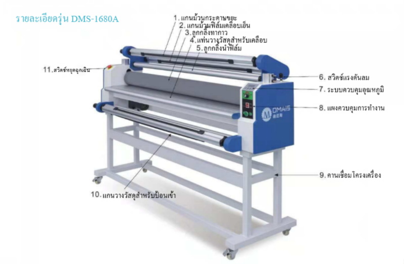 เครื่องเคลือบฟิล์มอัตโนมัติ รุ่น DMS-1680A ออกแบบมาสำหรับงานเคลือบฟิล์มขนาดใหญ่ รองรับฟิล์มความหนา 10-250 ไมครอน และความกว้างสูงสุด 1520 มม. มาพร้อมระบบควบคุมความเร็วแบบไม่จำกัด ระบบยกลูกกลิ้งด้วยลม และสวิทช์เท้าควบคุมการทำงาน เหมาะสำหรับงานเคลือบโปสเตอร์ แผ่นป้าย โฟมบอร์ด และสื่อสิ่งพิมพ์อุตสาหกรรม