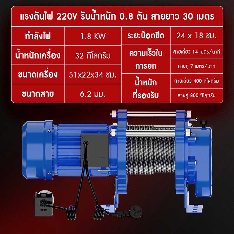 รุ่น 220V รับน้ำหนัก 0.8 ตัน สายสลิงยาว 30 เมตร