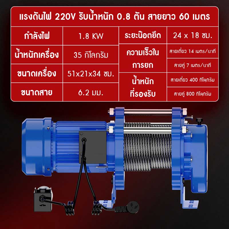 รุ่น 220V รับน้ำหนัก 0.8 ตัน สายสลิงยาว 60 เมตร