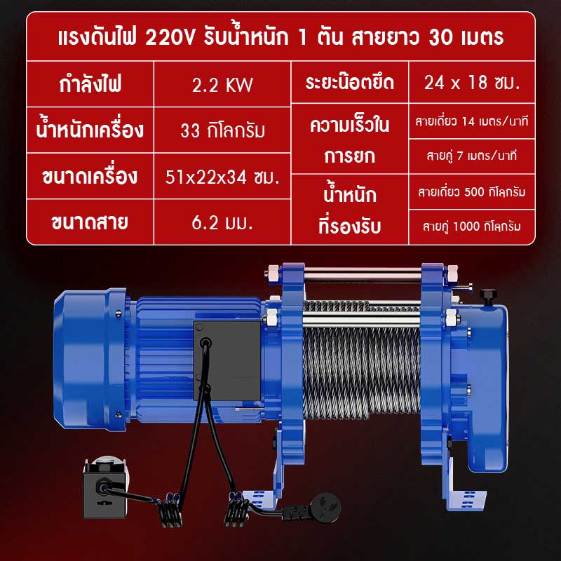 รุ่น 220V รับน้ำหนัก 1 ตัน สายสลิงยาว 100 เมตร