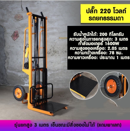 13. 220V รับน้ำหนัก 200 KG ยกสูงได้ 3 เมตร ความสูงเครื่อง2.05 เมตร 1600วัตต์ 0.78เมตร ความยาวเครื่อง 1.0เมตร ไม่สามารถเข็นได้ขณะมีสิ่งของ