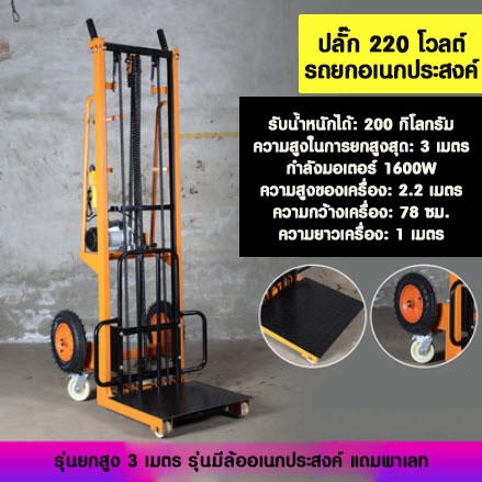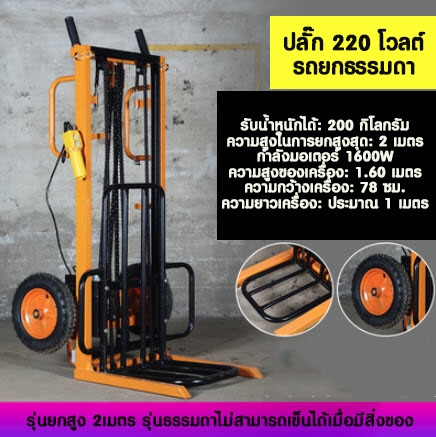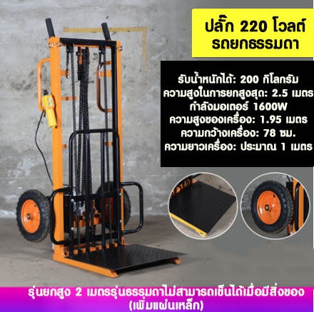 1. 220V รับน้ำหนัก 200 KG ยกสูงได้ 2 เมตร ความสูงเครื่อง1.60เมตร 1600วัตต์ ความกว้าง 0.78เมตร ความยาวเครื่อง 1.0เมตร ไม่สามารถเข็นได้ขณะมีสิ่งของ