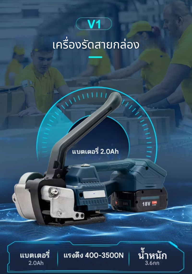 เครื่องรัดสายกล่องไฟฟ้า รุ่น V1 เป็นเครื่องมือรัดสายรัดพลาสติกแบบอัตโนมัติ ใช้งานง่าย สะดวก รวดเร็ว เหมาะสำหรับการบรรจุภัณฑ์ในอุตสาหกรรมขนส่ง คลังสินค้า และโรงงานผลิต รองรับสายรัด PP และ PET มีความแข็งแรงและทนทาน พร้อมแบตเตอรี่ประสิทธิภาพสูง ใช้งานได้ต่อเนื่อง
