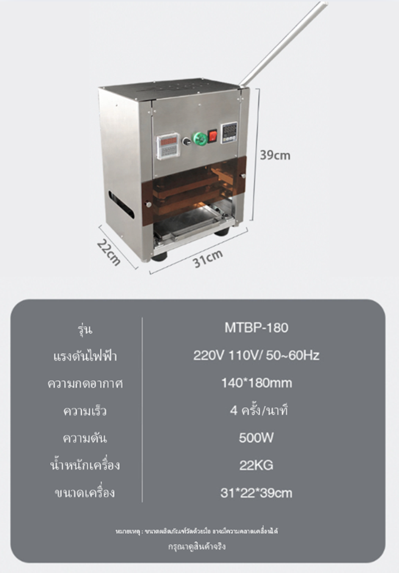 เครื่องบรรจุอาหารแบบฟองพลาสติก Foam Food Packaging Machine รุ่น MTBP-180 เป็นเครื่องจักรอัตโนมัติที่ออกแบบมาเพื่อบรรจุอาหารด้วยฟองพลาสติกคุณภาพสูง ช่วยให้กระบวนการบรรจุเป็นไปอย่างรวดเร็วและแม่นยำ พร้อมรักษามาตรฐานความปลอดภัยและคุณภาพของผลิตภัณฑ์ เหมาะสำหรับการใช้งานในอุตสาหกรรมอาหารที่ต้องการความมีประสิทธิภาพและความน่าเชื่อถือสูง