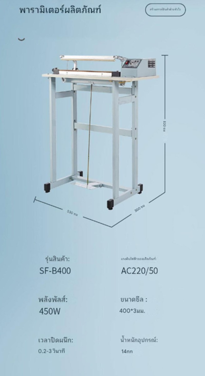 ขนาดหน้าเครื่องซีล: 400 มม. / 500 มม. (เลือกได้)