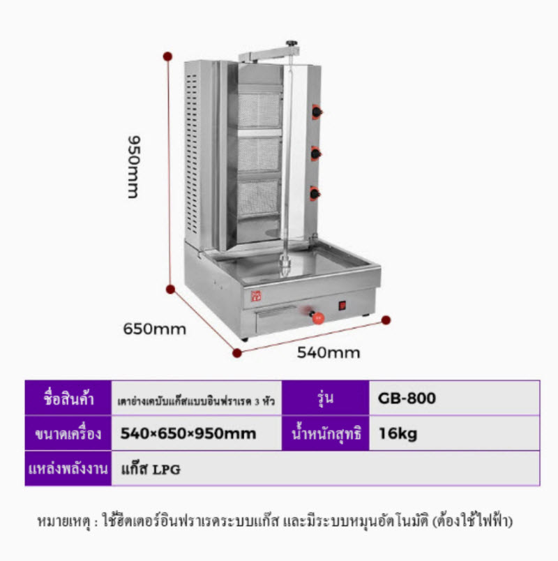 เตาย่างเคบับแก๊ส รุ่น GB-800 ออกแบบสำหรับย่างเนื้อเคบับหรือชิ้นเนื้อแบบหมุนอัตโนมัติ ให้ความร้อนสม่ำเสมอด้วยระบบแก๊ส LPG มาพร้อมมอเตอร์หมุนช่วยให้เนื้อสุกทั่วถึง เหมาะสำหรับร้านอาหาร ร้านสตรีทฟู้ด และธุรกิจอาหารที่ต้องการเพิ่มความรวดเร็วในการผลิต
