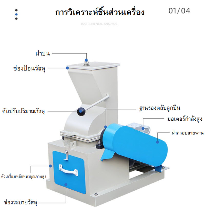 เชื่อมต่อไฟฟ้าและตั้งค่าแรงดันตามที่กำหนด ใส่วัสดุลงในช่องบรรจุขนาด 200x150 มม. เครื่องจะทำการบดวัสดุด้วยหัวค้อนหมุนจำนวน 9 ชิ้น วัสดุที่ผ่านการบดจะถูกกรองผ่านตะแกรงตามขนาดที่เลือก และออกทางช่องระบายด้านล่าง