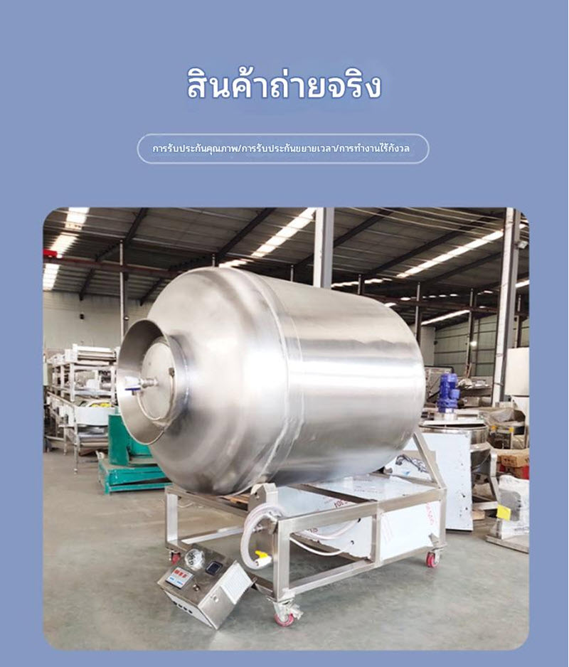 เครื่องนวดสุญญากาศอุตสาหกรรม ขนาดถังใหญ่ ผลิตจากสแตนเลสเกรดอาหาร ใช้สำหรับนวดและหมักเนื้อสัตว์ในระบบสุญญากาศ ช่วยให้น้ำหมักซึมเข้าสู่เนื้อได้ดีขึ้น เพิ่มความนุ่ม และรสชาติที่สม่ำเสมอ เหมาะสำหรับโรงงานแปรรูปอาหารและโรงฆ่าสัตว์ที่ต้องการคุณภาพระดับอุตสาหกรรม
