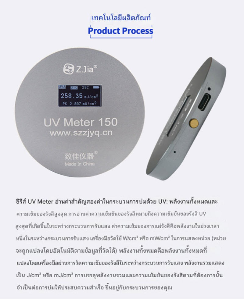 เครื่องวัดพลังงาน UV LED รุ่น UV Meter 150 ออกแบบมาสำหรับตรวจวัดความเข้มแสงและพลังงานสะสมจากแหล่งกำเนิดแสง UV LED โดยเฉพาะ รองรับความยาวคลื่น 365/380/395/405nm พร้อมหน้าจอ LCD แสดงค่าชัดเจน ใช้งานง่าย เหมาะสำหรับโรงงานอุตสาหกรรม งานพิมพ์ UV และการควบคุมคุณภาพการอบแห้งด้วย UV LED