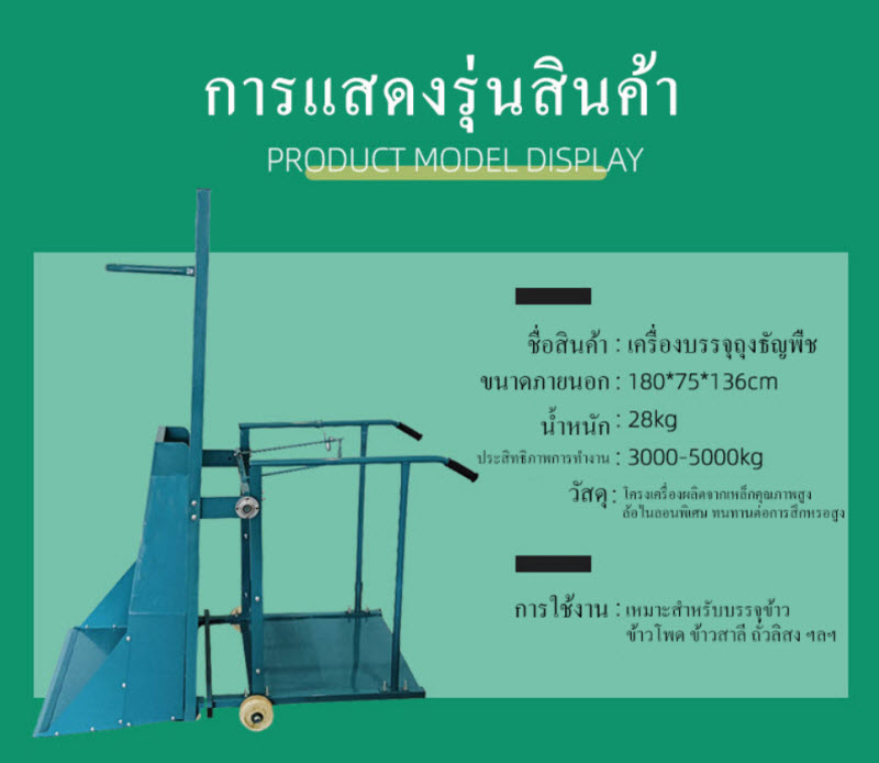 เครื่องบรรจุถุงธัญพืช โครงสร้างแข็งแรง ผลิตจากเหล็กหล่อคุณภาพสูง ออกแบบให้ใช้งานง่าย เหมาะสำหรับการบรรจุธัญพืช เมล็ดพืช และวัตถุดิบแห้งต่างๆ ตัวเครื่องติดตั้งล้อไนลอนที่ทนต่อการสึกหรอ ช่วยให้เคลื่อนย้ายสะดวก เหมาะสำหรับฟาร์ม ร้านค้าส่ง โรงสีขนาดเล็ก และธุรกิจแปรรูปธัญพืช