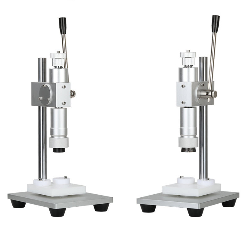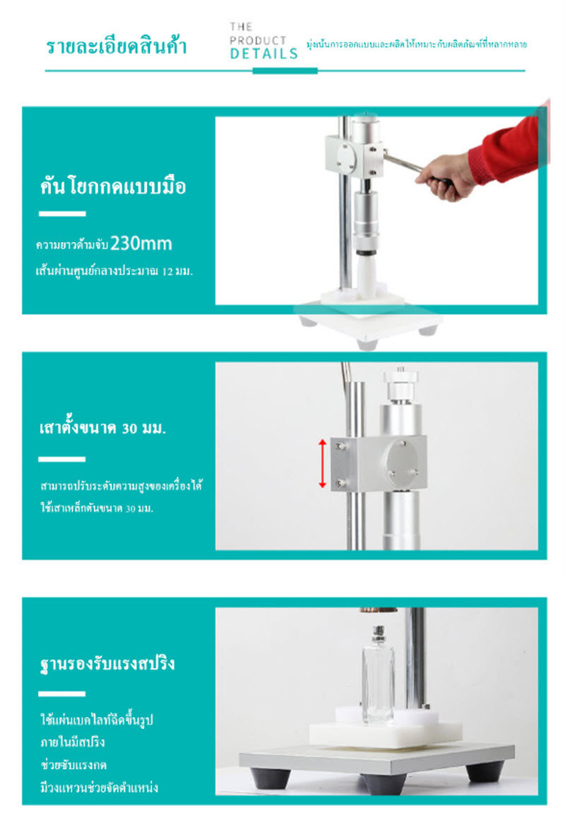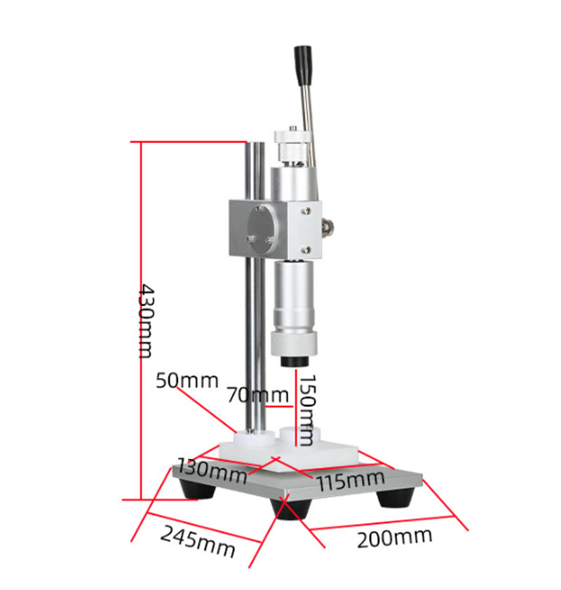 เครื่องปิดฝาขวดน้ำหอมแบบมือโยก รุ่น WT-90XZ โครงสร้างแข็งแรง แกนเหล็กตันชุบโครเมียม ขนาด 30 มม. รองรับขวดสูงสุด 150 มม. เหมาะสำหรับงานผลิตน้ำหอม เครื่องสำอาง และบรรจุภัณฑ์ขนาดเล็กถึงกลาง ใช้งานง่าย ควบคุมแรงกดได้แม่นยำ