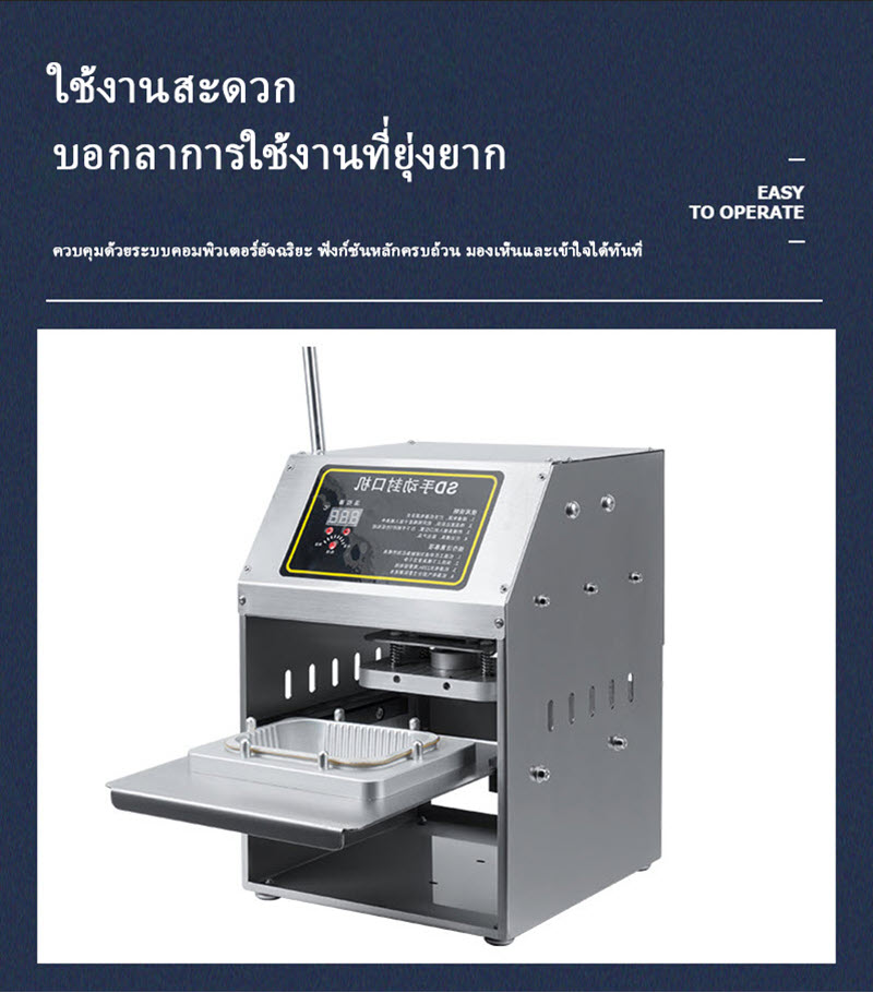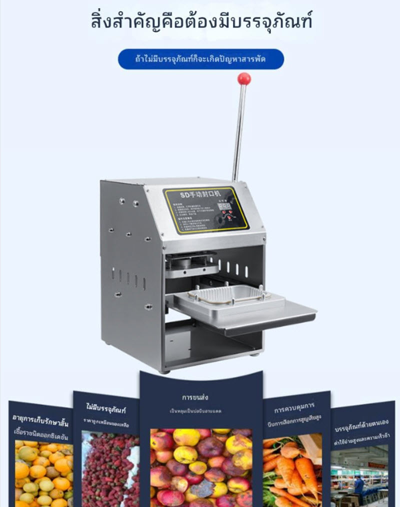 ใช้งานง่ายด้วยระบบกดมือ แข็งแรงด้วยโครงสร้างเหล็กและสแตนเลส เหมาะสำหรับร้านอาหารหรือผู้ประกอบการบรรจุอาหาร