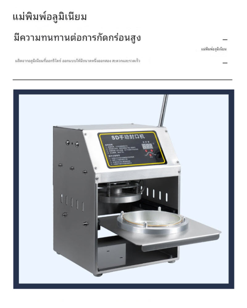 เครื่องซีลฟิล์มแบบมือโยก รุ่น SD สำหรับซีลถาดอาหาร ใช้งานง่ายด้วยระบบกดมือ แข็งแรงด้วยโครงสร้างเหล็กและสแตนเลส เหมาะสำหรับร้านอาหารหรือผู้ประกอบการบรรจุอาหาร