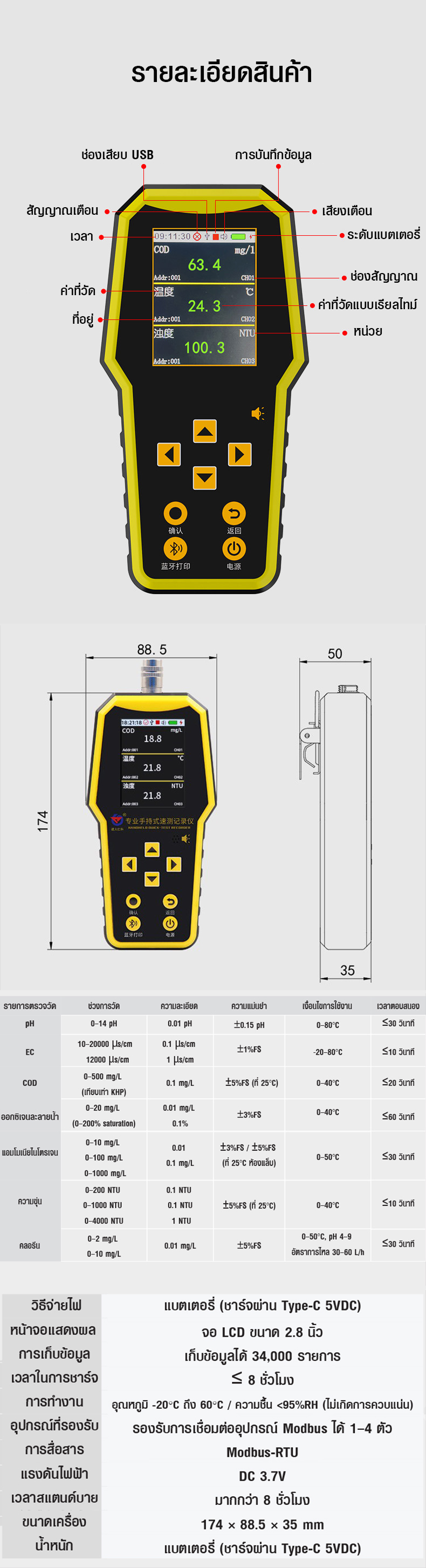 เครื่องวัดคุณภาพน้ำ pH EC แบบพกพา 2.8นิ้ว Portable Water Quality Meter ModBus