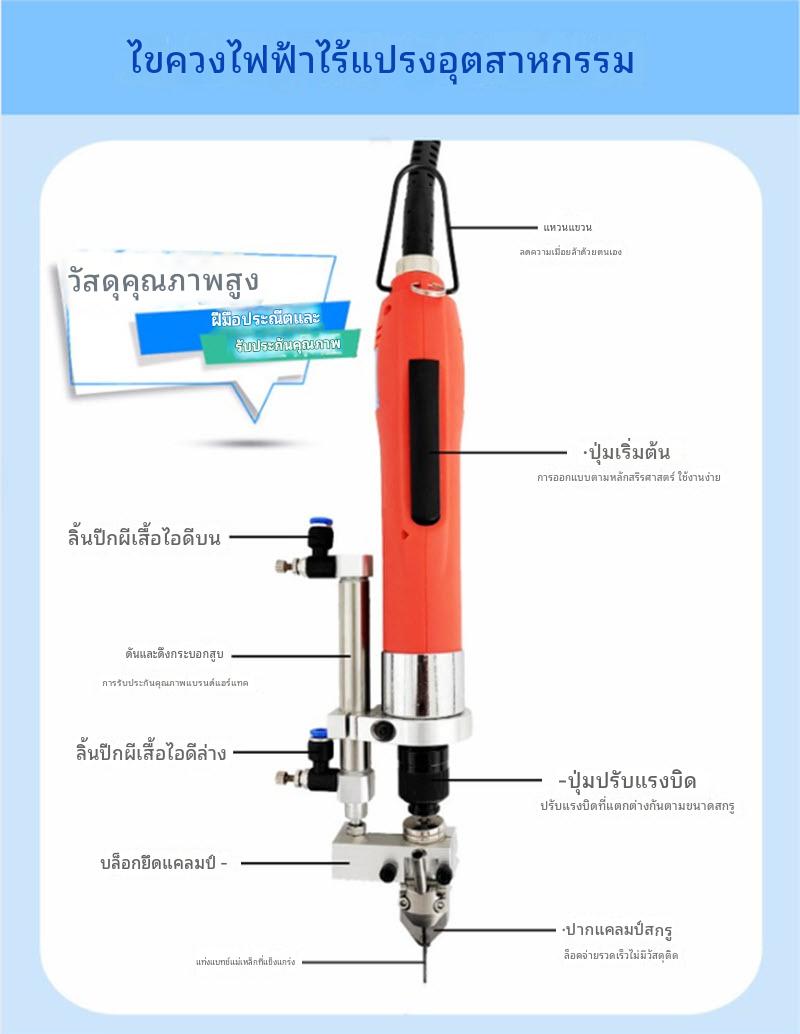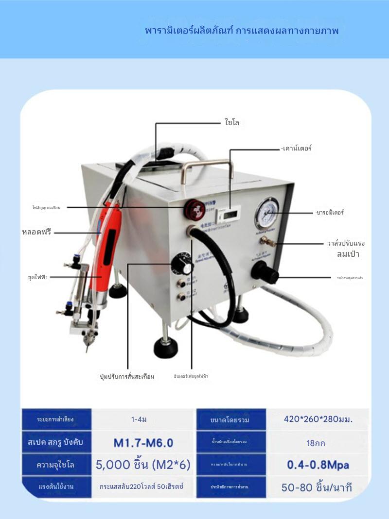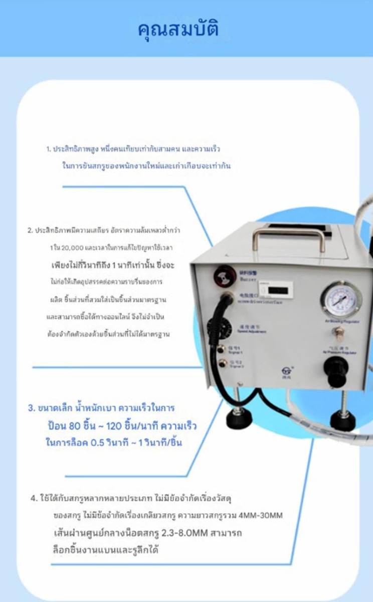 เชื่อมต่อไฟฟ้าและลมเข้ากับตัวเครื่อง เทสกรูลงในถังความจุ 5,000 ชิ้น ปรับแรงดันลมให้เหมาะสม ตั้งค่าความเร็วที่ต้องการ จากนั้นใช้หัวจับสกรูยิงลงบนชิ้นงาน ตัวเครื่องจะป้อนและยิงสกรูโดยอัตโนมัติตามจังหวะการทำงาน
