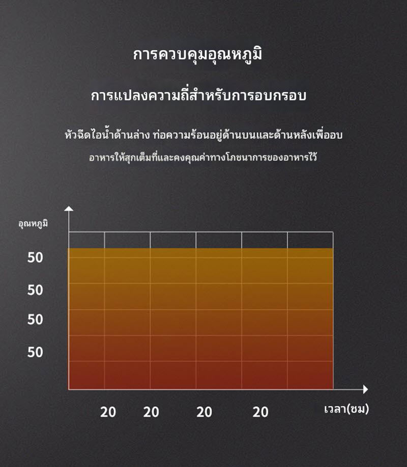 • ควรพรีฮีทเตาอบประมาณ 5-10 นาทีเพื่อให้ได้ผลลัพธ์ดีที่สุด