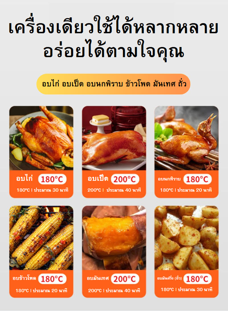 • เหมาะกับการอบอาหารที่ต้องการความร้อนรอบทิศทาง เช่น ไก่ย่างทั้งตัว เป็ดย่าง มันฝรั่งย่าง