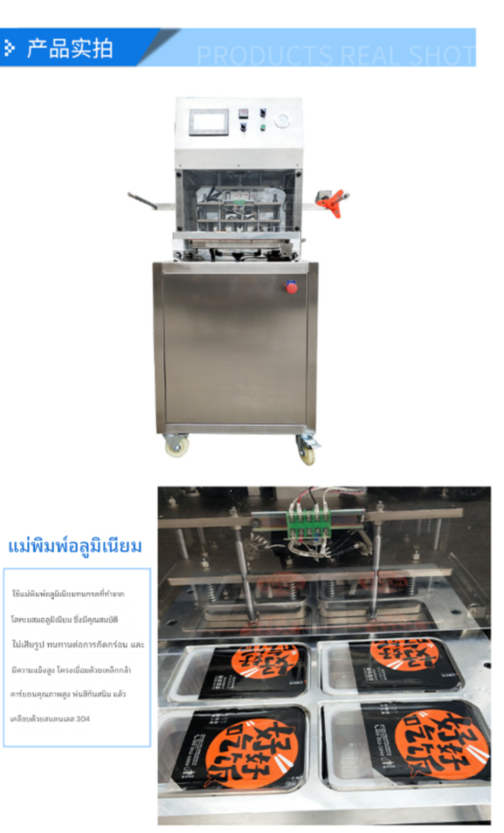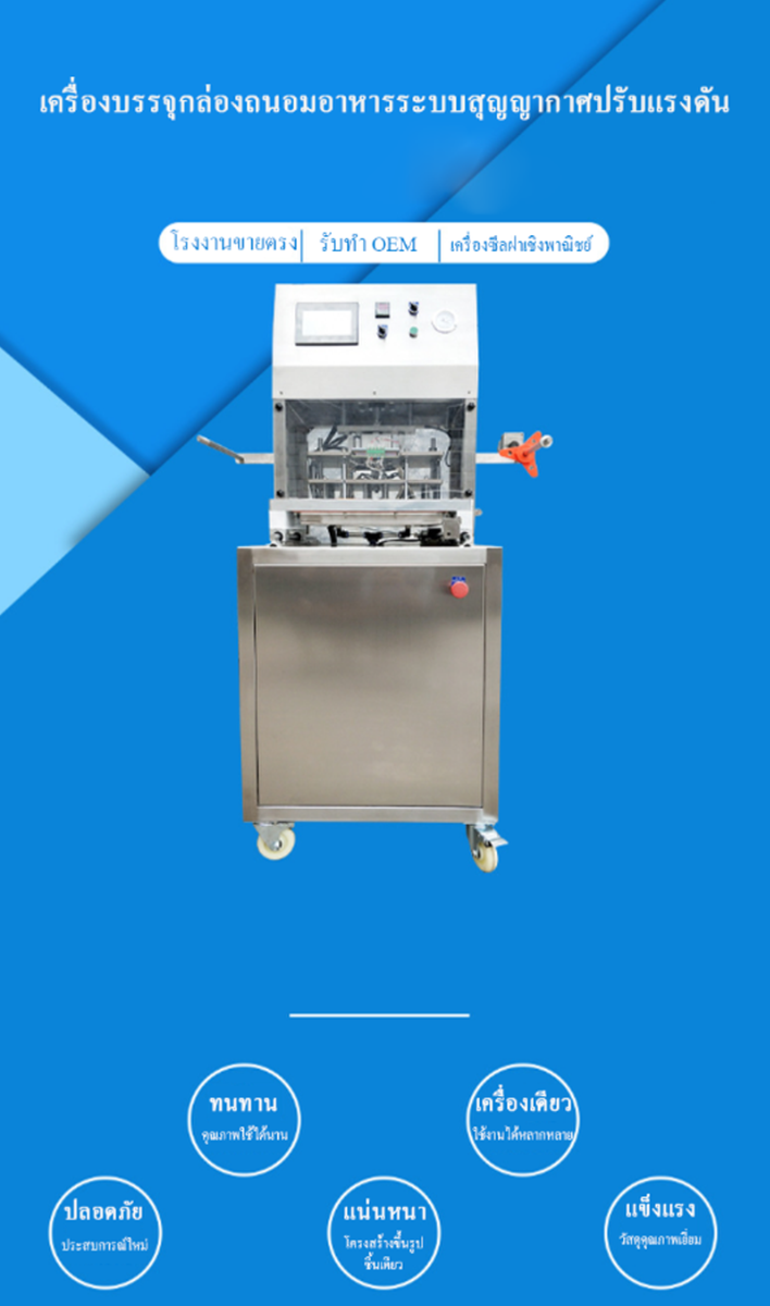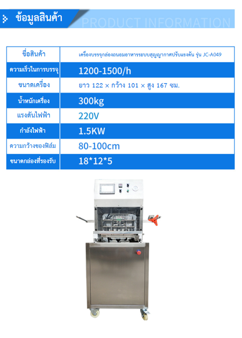 เครื่องซีลสุญญากาศอัตโนมัติสำหรับกล่องอาหาร รุ่น JC-A049 ออกแบบมาสำหรับบรรจุภัณฑ์แบบ MAP (Modified Atmosphere Packaging) ใช้แรงดันสุญญากาศควบคู่กับระบบซีลฟิล์ม รองรับกล่องขนาดไม่เกิน 18 × 12 × 5 ซม. และฟิล์มกว้างถึง 100 ซม. เหมาะสำหรับบรรจุเนื้อสัตว์ อาหารทะเล ผัก ผลไม้ และอาหารพร้อมทาน เพื่อยืดอายุสินค้าอย่างมีประสิทธิภาพ