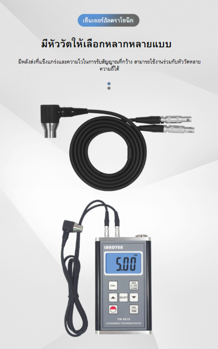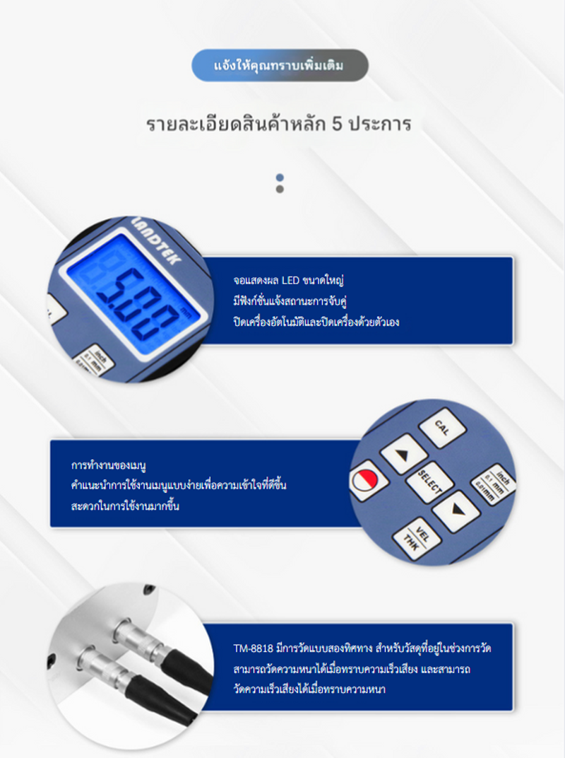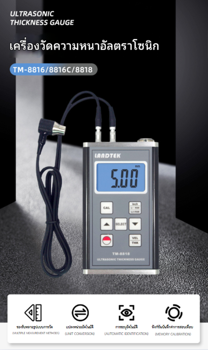 เครื่องวัดความหนาโลหะด้วยระบบอัลตราโซนิก รุ่น TM-8818 โครงสร้างแข็งแรง หน้าจอดิจิตอลขนาดใหญ่พร้อมไฟแบ็กไลท์ วัดได้แม่นยำ เหมาะกับการตรวจสอบความหนาโลหะและวัสดุต่างๆ ใช้งานง่าย พกพาสะดวก
