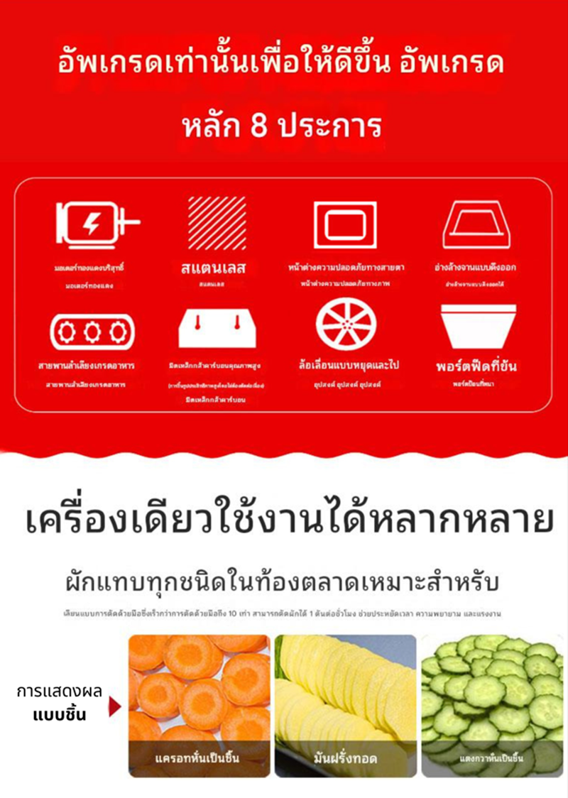 เครื่องหั่นผักอเนกประสงค์อัตโนมัติ Vegetable Cutting รุ่น 660 (UPGRADE) เป็นนวัตกรรมที่ออกแบบมาเพื่อตอบโจทย์ในด้านการเตรียมผักในครัว ไม่ว่าจะเป็นการหั่น ซอย หรือสไลด์ผักให้มีความสม่ำเสมอและสวยงาม โดยรุ่น UPGRADE นี้ได้รับการปรับปรุงทั้งในเรื่องของประสิทธิภาพและความปลอดภัย เพื่อให้การใช้งานง่ายและรวดเร็วมากยิ่งขึ้น