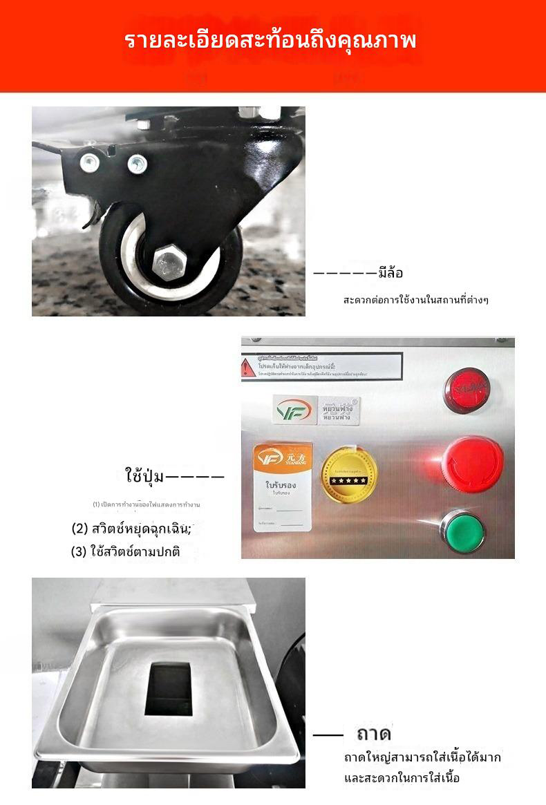 | รุ่น | แรงดันไฟฟ้า | กำลังไฟฟ้า | ขนาดผลิตภัณฑ์ (มม.) | กำลังการผลิต (กก./ชม.) | น้ำหนัก (กก.) |